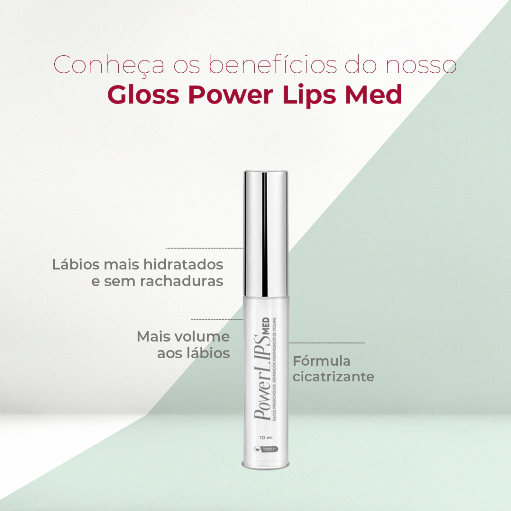 Nosso Gloss PowerLips MED reúne estética e tratamento para lábios mais volumosos, hidratados e sem rachaduras. Em sua fórmula inovadora podemos contar com ativos altamente cicatrizantes, hidratantes e formadores de queratina, bem como o ácido hialurônico de baixo peso molecular que além de dar volume aos lábios, também auxilia na hidratação.